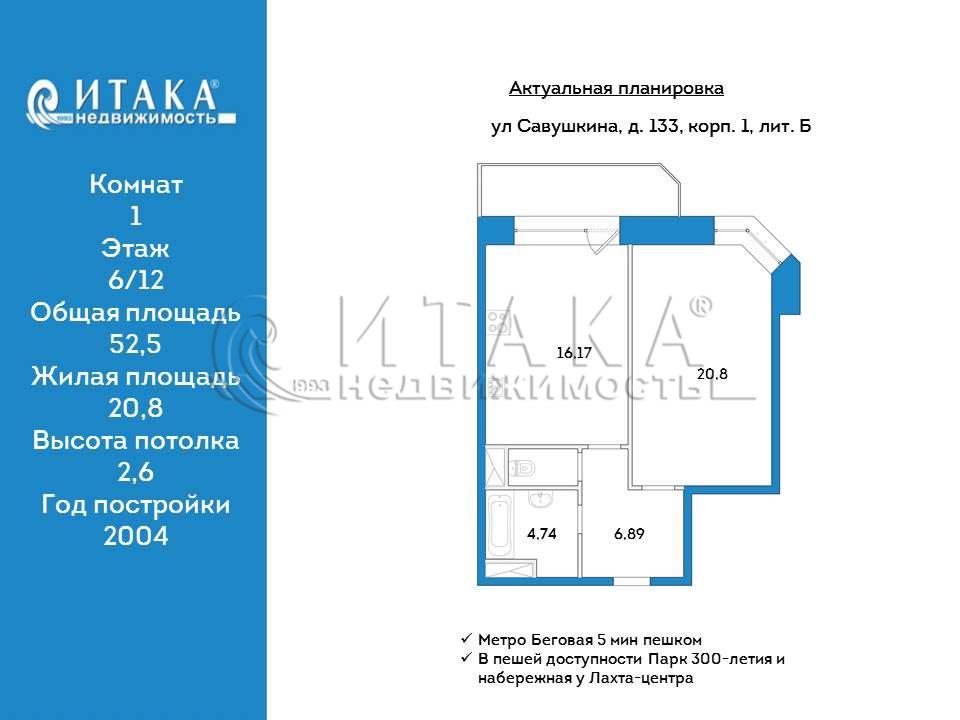Предлагается к продаже большая светлая однокомнатная квартира 52,5 кв.м. с поистине европейской планировкой.Гостиная – 20,8 кв. м, кухня 16,17 кв. м с выходом на балкон, 6-й этаж в добротном кирпичном доме. Чистые юридически документы, три взрослых собственника. Лёгкая встречная покупка.Тёплый, кирпичный дом всего в 12 этажей — здесь царит атмосфера уюта, а не чувство «человейника».Идеальная чистота и порядок как в парадной, так и на благоустроенной придомовой территории, порядочные соседи. Лучшая локация в городе! Район мечты:Достаточно выйти из дома ,чтобы оказаться в центре событий и всего за 5 минут пешком дойти до станции метро «Беговая». Всего 15 минут на метро — и вы на Невском проспекте (4 остановки без пересадок!).В пешей доступности всё, что нужно для жизни и отдыха:парк 300-летия с песчаным пляжем.Футуристичная набережная у Лахта-центра.Яхтенный мост для романтических прогулок.Зимой — огромный открытый каток у Флагштока.«Газпром Арена» — дойти пешком легко!Удобный и быстрый выезд на КАД и ЗСД. Всё под рукой — инфраструктура развита безупречно:Для быта: Детсады, школа с углублённым английским, поликлиники, паспортный стол, МФЦ — всё в своем микрорайоне.Шопинг и развлечения: ТРК «Меркурий» и «Атлантик-Сити» с кинотеатрами и ресторанами — в шаге от дома. Магазины от «ВкусВилла» до «Ленты».Спорт: «Питерлэнд», «Фитнес 24», «СпортЛайф», теннисные корты.Эта квартира — идеальный выбор для тех, кто ценит комфорт, локацию и динамику городской жизни.Звоните, приходите на просмотр! Оперативно покажем!