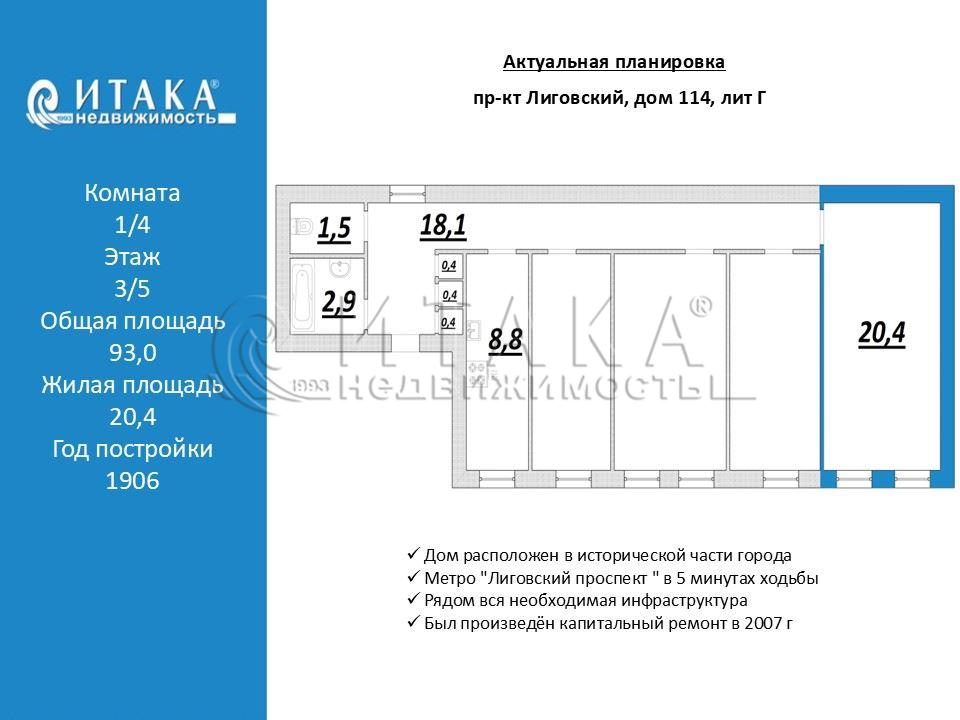 Предлагается к продаже комната 20.4 кв. м в 4-х комнатной квартире. Комната правильной формы с двумя окнами. Окна выходят в тихий двор, что позволяет живя в центре города наслаждаться тишиной. Собственник разделил комнату перегородкой на две небольшие комнаты и прихожую. Перегородка легко демонтируется, если вам не нужны две комнаты. Квартира малонаселенная, проживает 3 человека. Дом расположен в исторической части города в 5 минутах ходьбы от станции метро "Лиговский проспект ". Нотариальные отказы получены. Собственность более 5 лет. Один взрослый собственник.