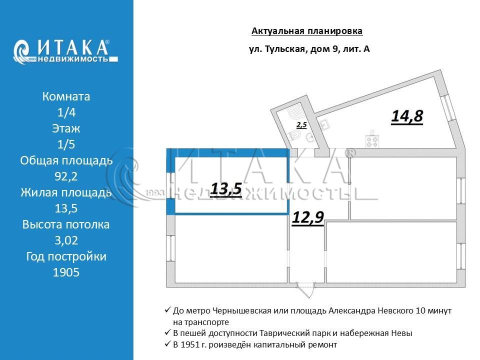 В прямой продаже комната 13,5 кв. м в малонаселенной квартире. Комната готова к проживанию, все что видите на фото останется новому собственнику. Кухня 14 кв.м, есть свое место, при желании можно поставить холодильник и стиральную машинку. Рядом есть все необходимое для комфортной жизни. В пешей доступности Таврический парк и набережная Невы. До метро Чернышевская или площадь Александра Невского 10 минут на транспорте. Один взрослый собственник, на сделке будет лично Документы к сделке готовы (два отказа и одно уведомление). Возможен быстрый выход на сделку. Звоните и приходите на просмотр!